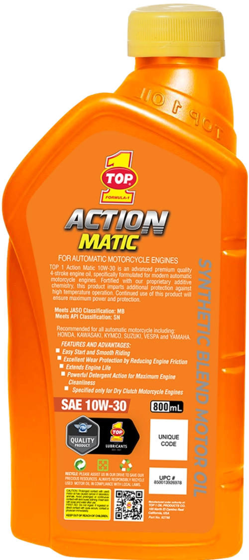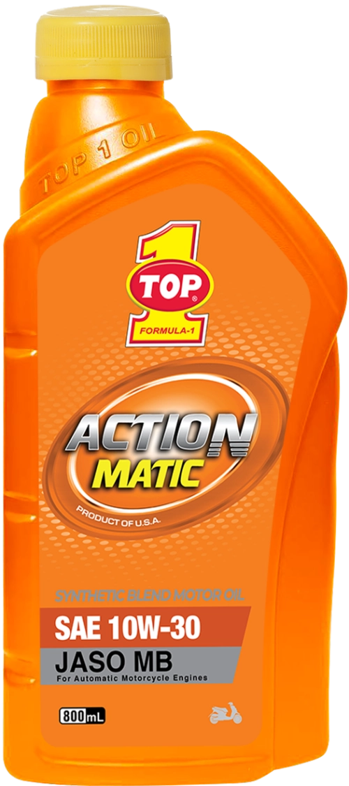 TOP 1 ACTION MATIC is an advanced premium quality 4-stroke motorcycle engine oil, specifically formulated for modern automatic motorcycle engines. Fortified with our proprietary additive chemistry, this product imparts additional protection against high temperature operation. Our advanced technology will reduce the coefficient of friction of the oil and offers superior resistance to oxidation. Continued use of this product will ensure maximum power and protection.