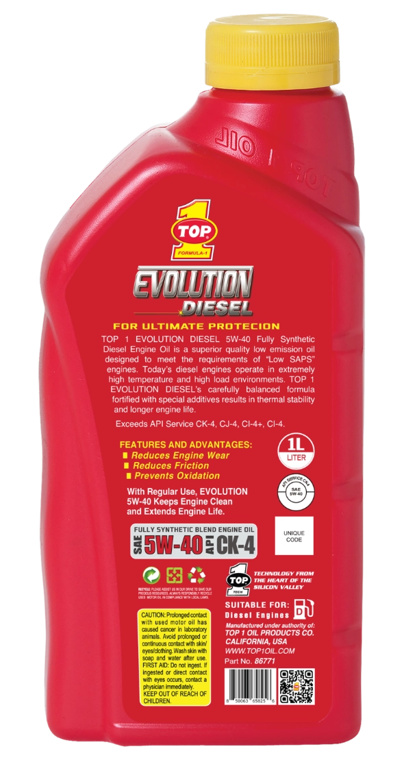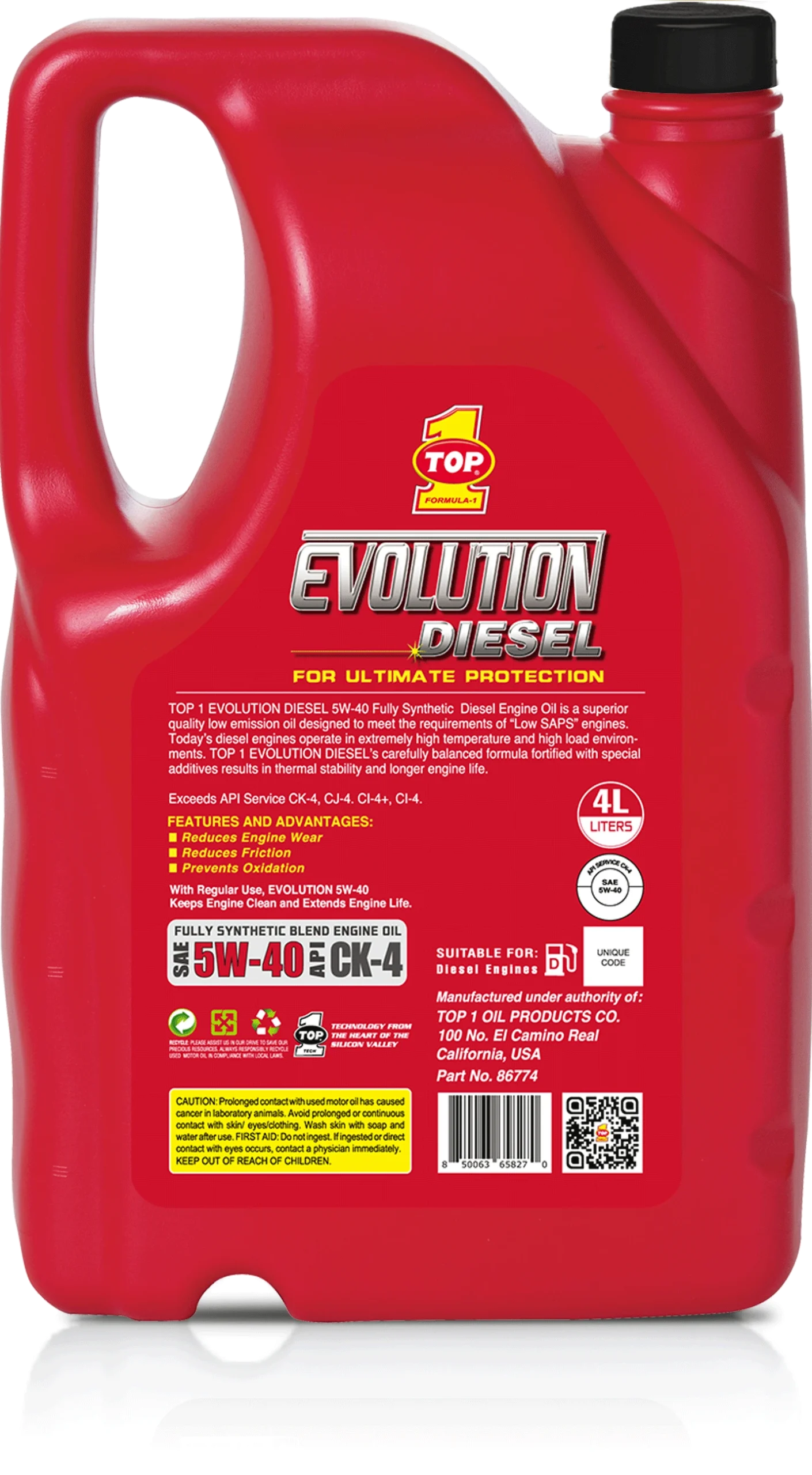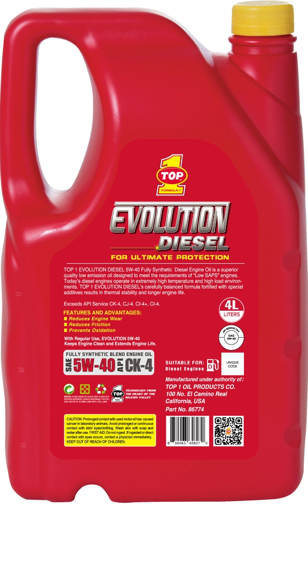 EVOLUTION DIESEL is a Fully Synthetic Diesel Engine Oil is a superior quality oil formulated with premium quality base oils and additives, designed to give excellent performance in all emission compliant engines using ultra low sulfur diesel fuel (ULSD). EVOLUTION DIESEL is formulated to reduce engine wear and friction while preventing oxidation.